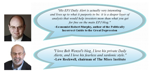 The range of subscribers to the EPJ Daily Alert is remarkable. Not only is it businessmen and investors, but also government economists, top billion dollar fund managers, and former top ranking senior government officials. Even, high-level insider, former Treasury Secretary Robert Rubin calls my writing "serious work." Former Congressman Ron Paul, who was Chairman of the House Financial Services Subcommittee on Domestic Monetary Policy has emailed me: "Robert, Thanks for all your recent posts and articles. Great job on the Fed."